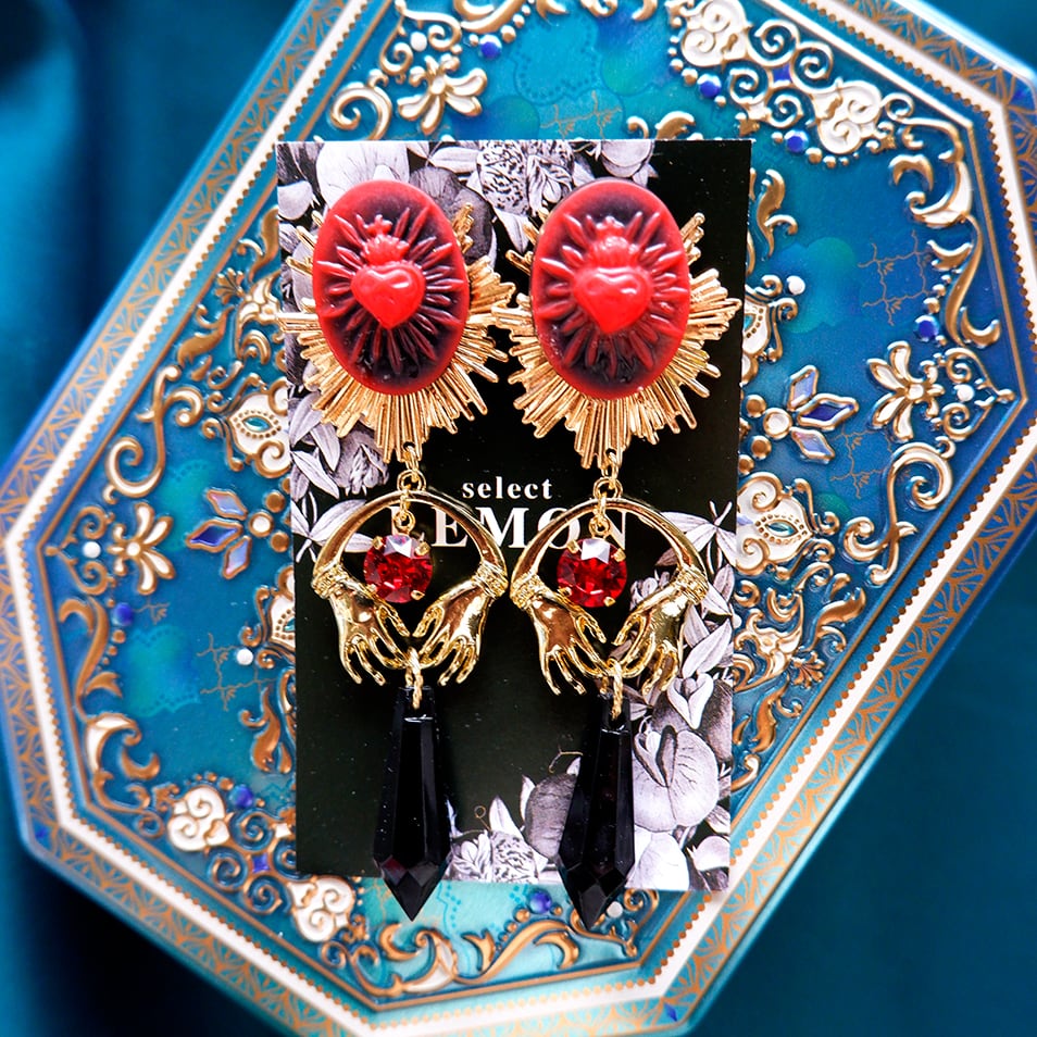 燃えるような赤いハートとゴールドの放射状の光を模したモチーフが特徴的なデザイン。宗教的インスピレーションを感じさせるアートピースです。