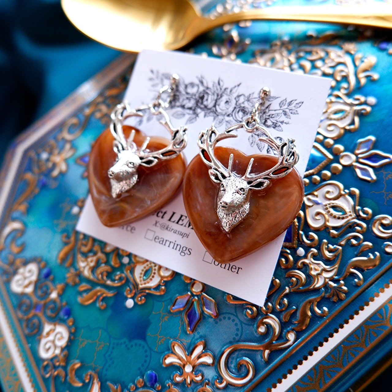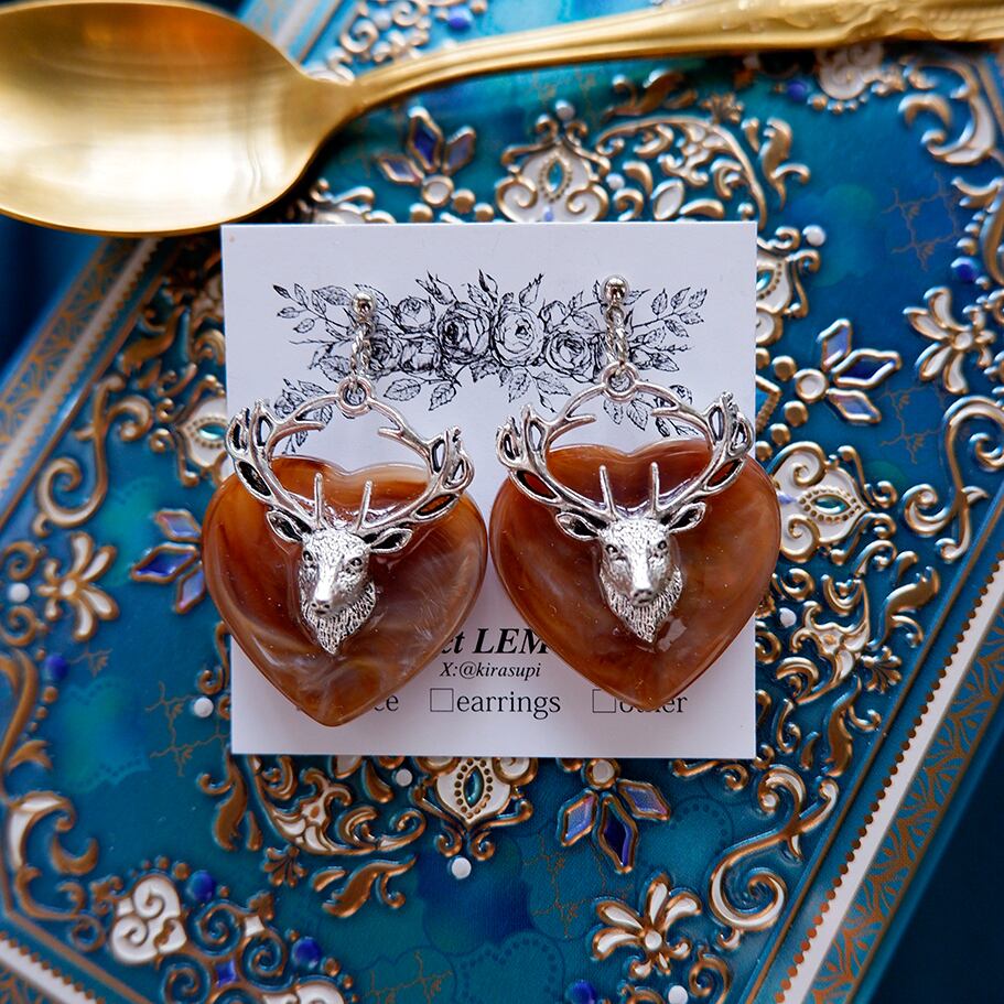 鹿の頭モチーフとマーブル模様のハートが合わさった個性的で美しい耳飾りです。