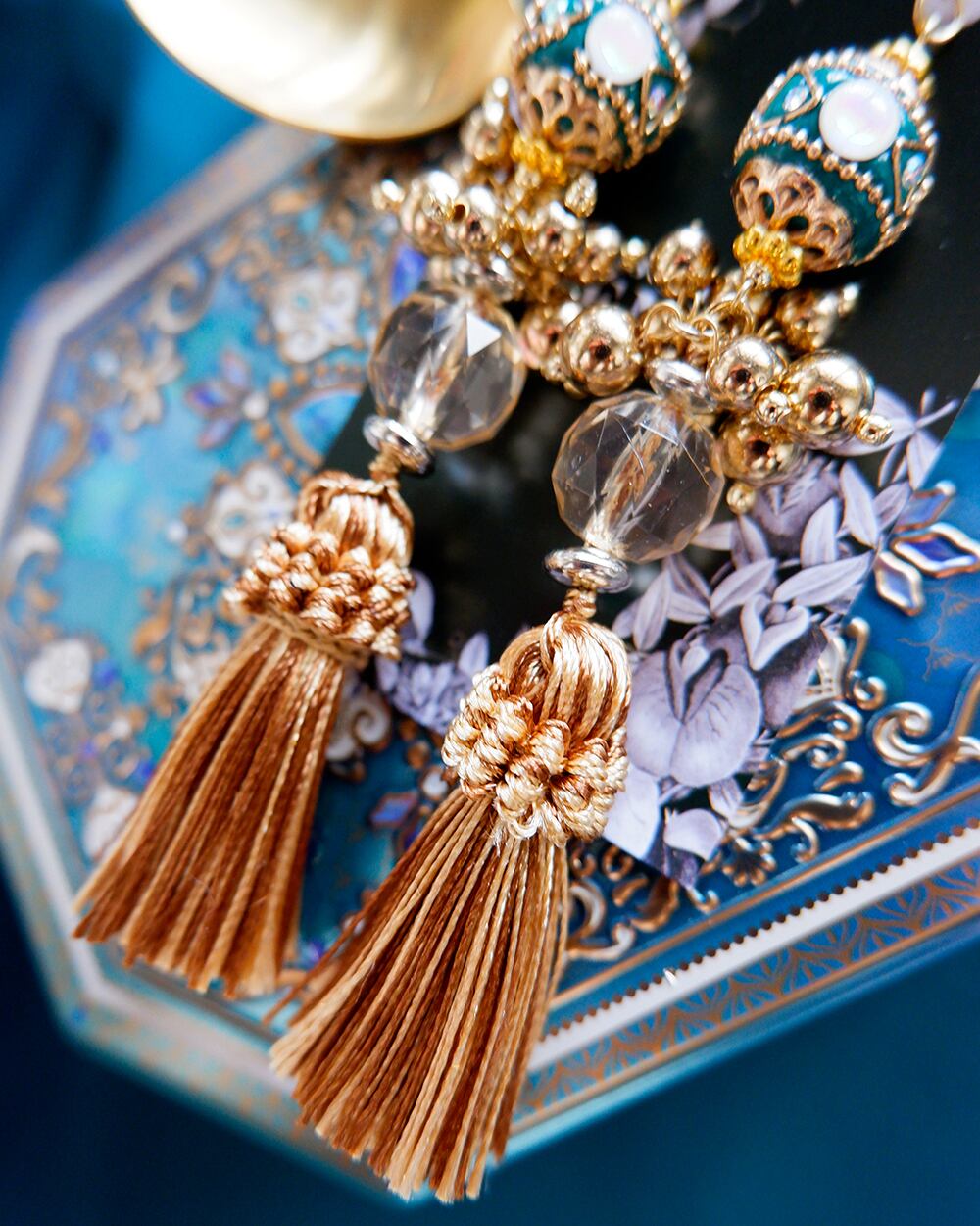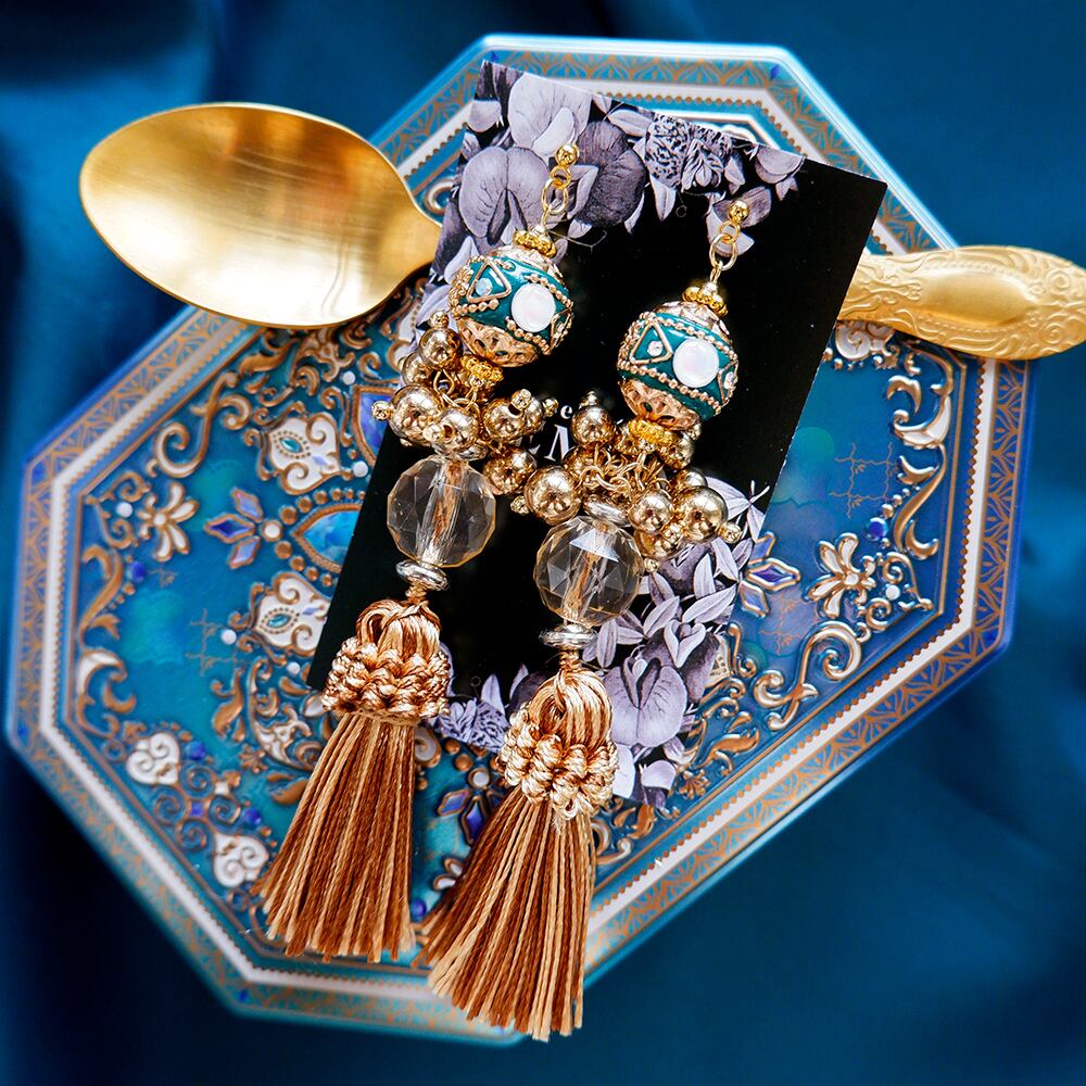 トップにターコイズブルーの丸いチャームが配置され、ゴールドの装飾とパールがアクセントとなり、孔雀の羽のような華やかさを演出します。チャームには繊細な模様が施され伝統的な美しさが感じられます。ゴールドのタッセルがあしらわれ、動きに合わせて優雅に揺れることで、孔雀が羽を広げたようなゴージャスな印象を与えます。全体的にオリエンタルな雰囲気とモダンなデザインが融合した、存在感のある仕上がりです。
