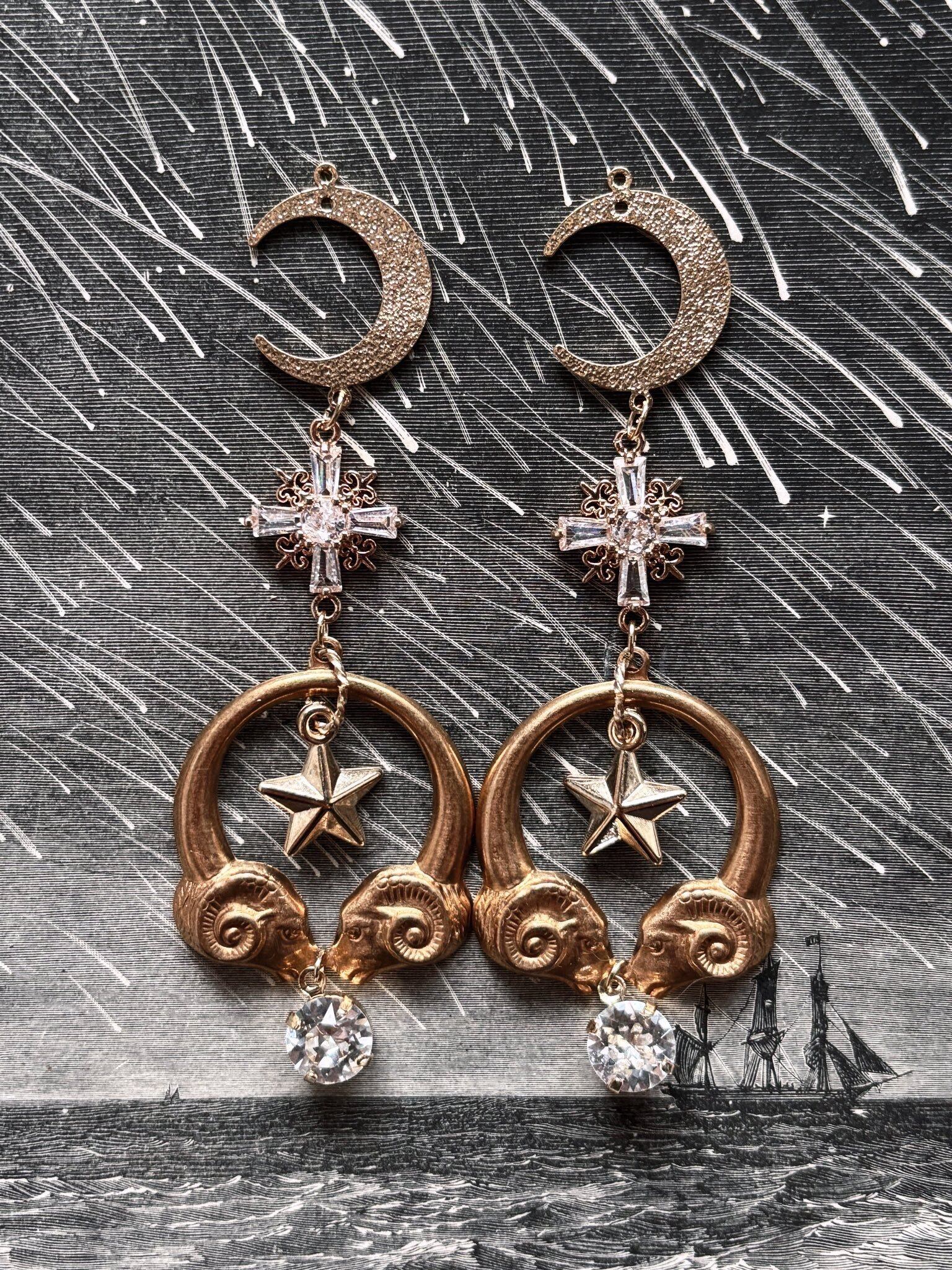 夜空をイメージしたこのイヤリングは、きらめく三日月と星が織りなす幻想的な美しさが特徴。ゴールドトーンのフレームには、繊細なラム(羊)のモチーフが施され、古代の神話や星座を思わせるロマンティックな雰囲気を漂わせます。