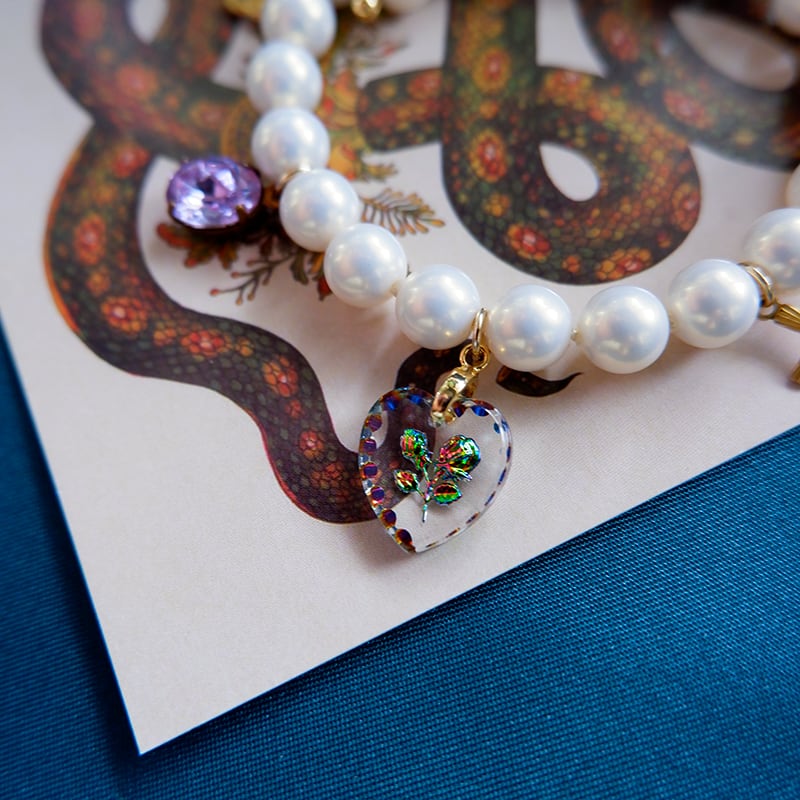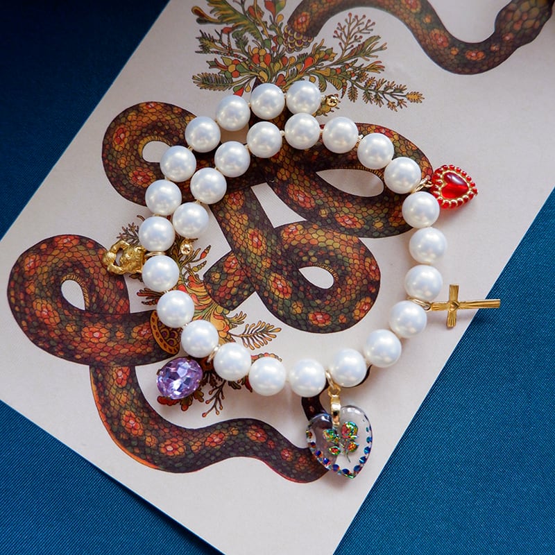 光沢のあるパールに、ハート、クロス、宝石モチーフのチャームを贅沢に散りばめたブレスレット。信仰、愛、希望を象徴するお守りのような存在感。毎日に寄り添う祈りのアクセサリー。