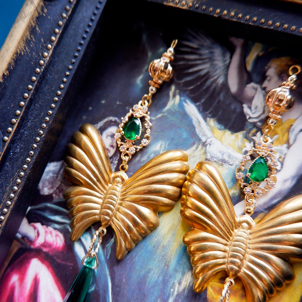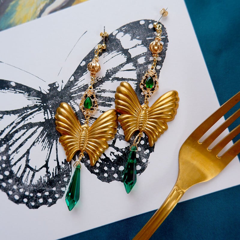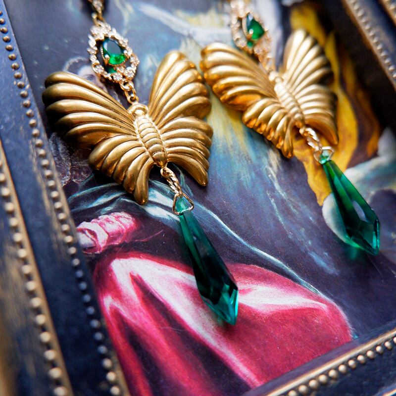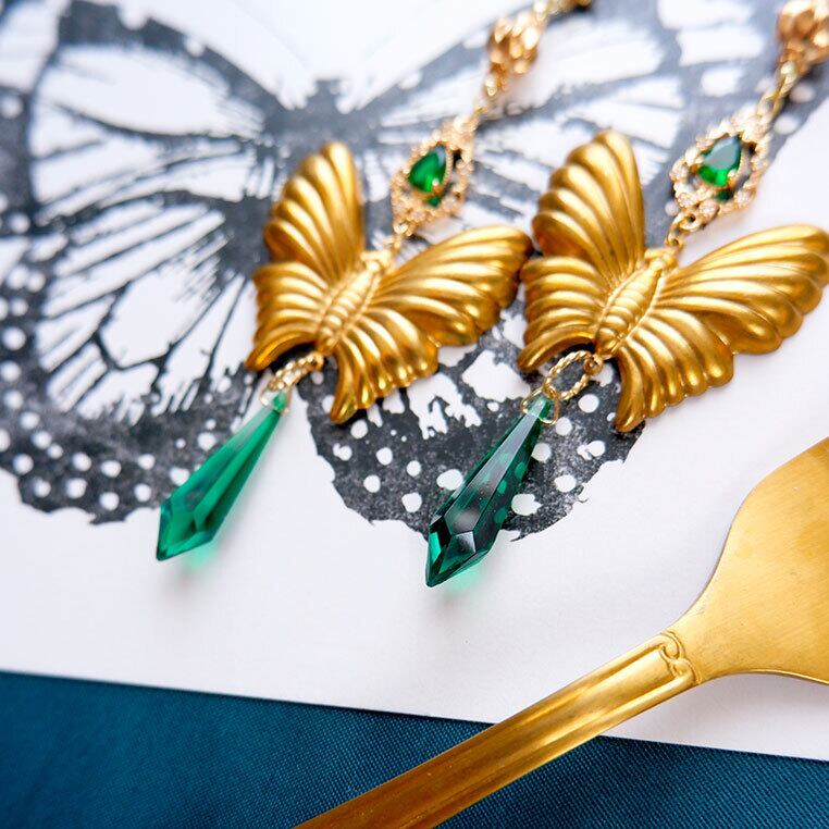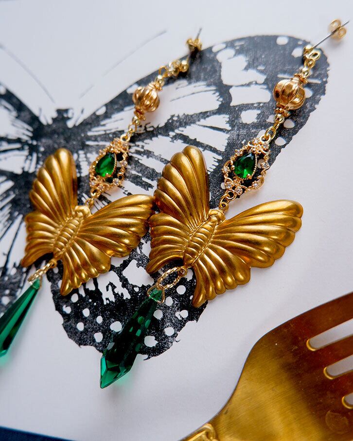 まるでアンティーク絵画から飛び出したような幻想的なピアス。立体感あるゴールドの蝶と、深いグリーンのしずく型ストーン(ドイツビンテージガラス)が、神秘的で高貴な雰囲気を醸し出します。