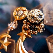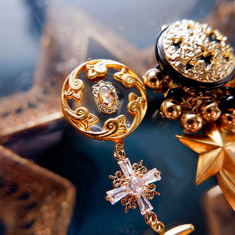 左:クラシカルな透かし模様のボタンに、クロスと月星のチャームが揺れる神秘的なデザイン