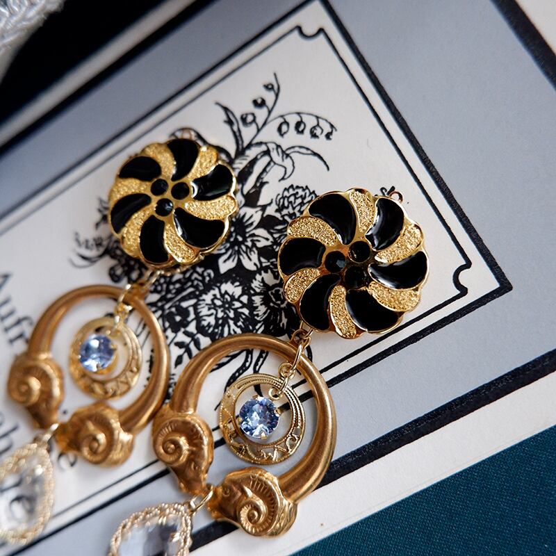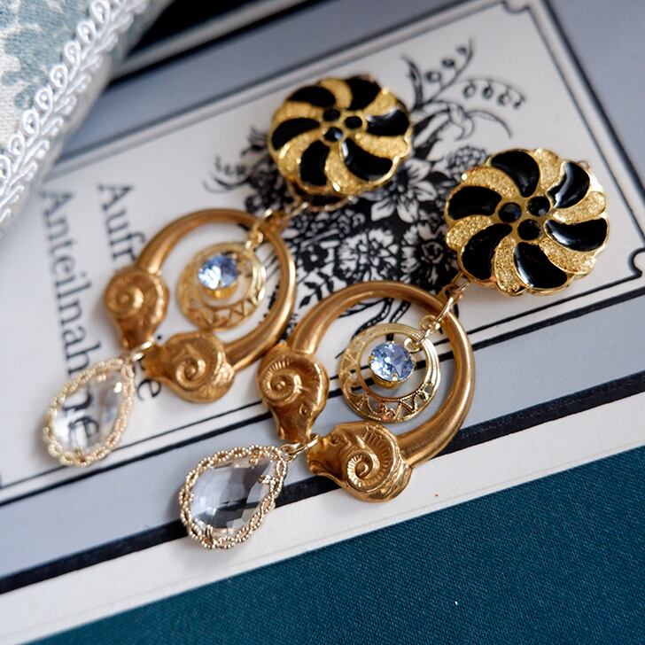 ブラックとゴールドのエナメル調トップに輝くビジューが、まるで星のように煌めき、下部に揺れる雫型のクリスタルが気高く光を受けて揺れます。