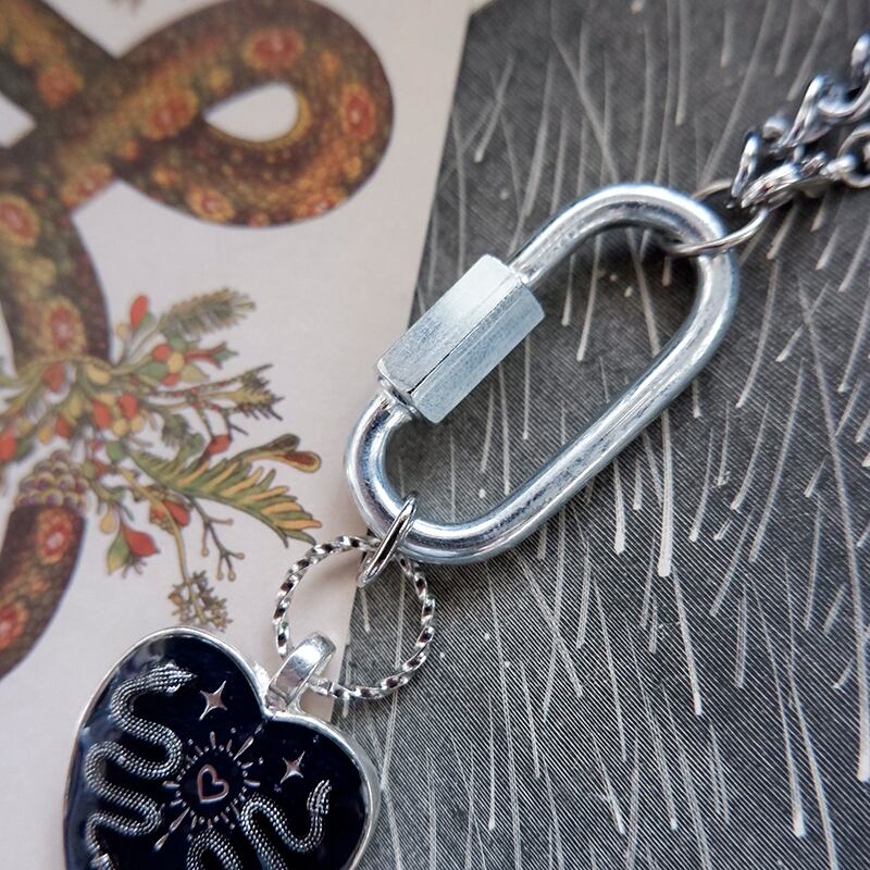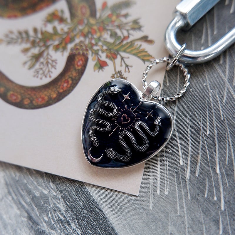 深いブルーのハートに月と星が描かれ、蛇モチーフの背景と調和したヴィンテージ感あふれるデザインです。