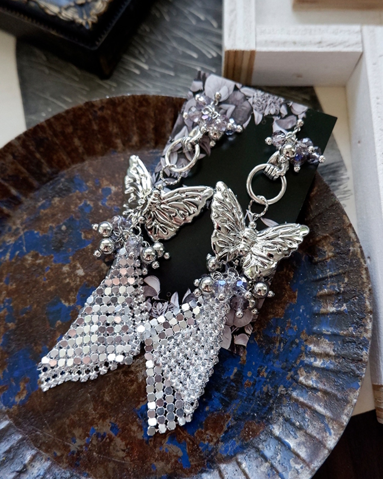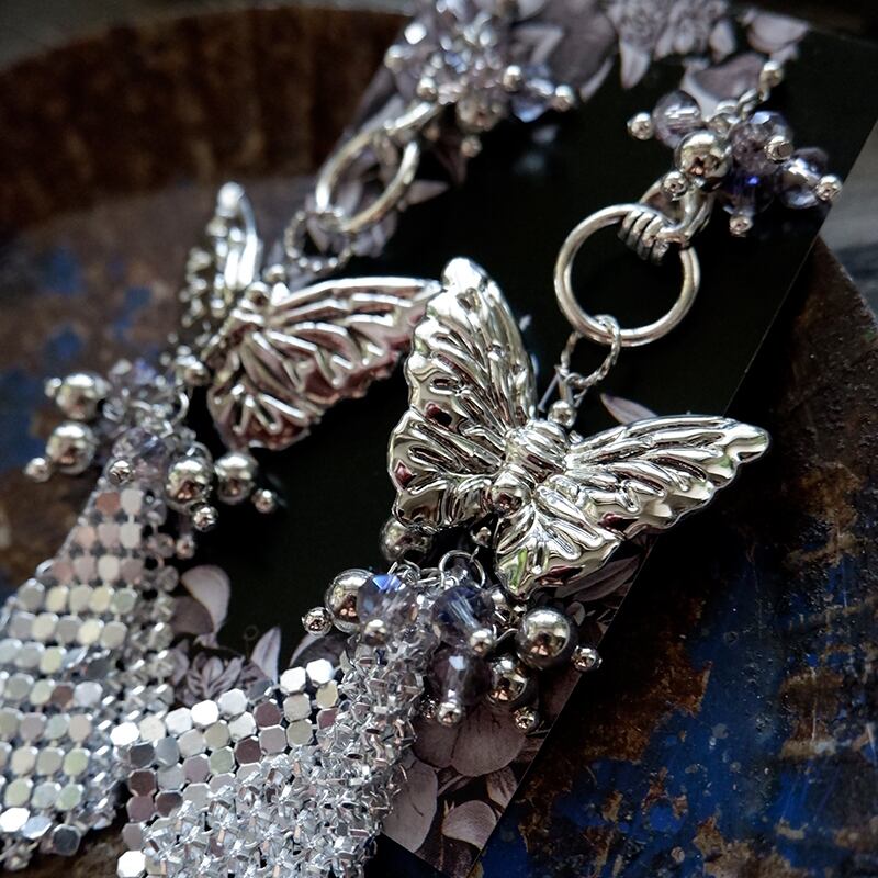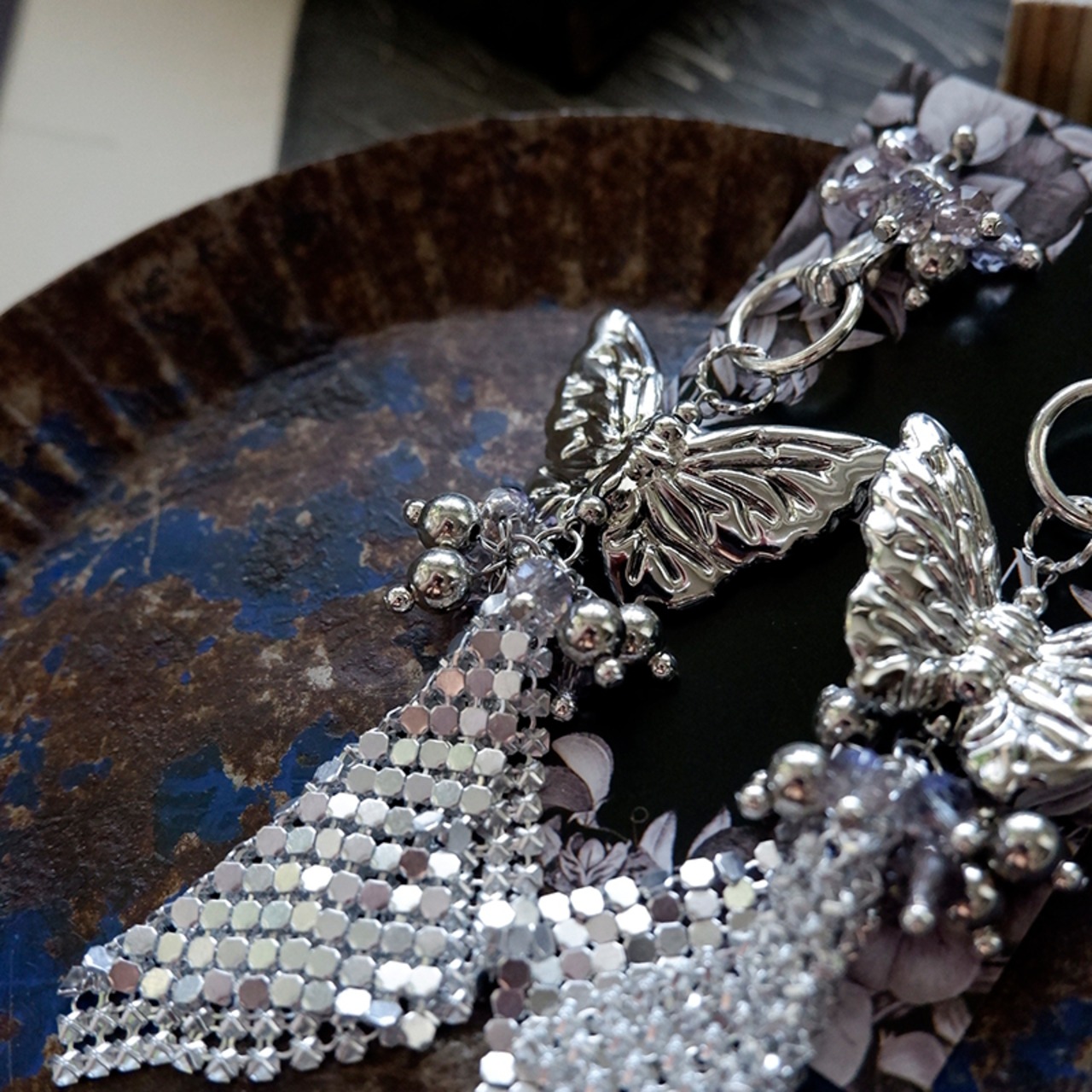 大ぶりの蝶モチーフに、シルバーのメッシュフリンジが軽やかに揺れるデザイン。