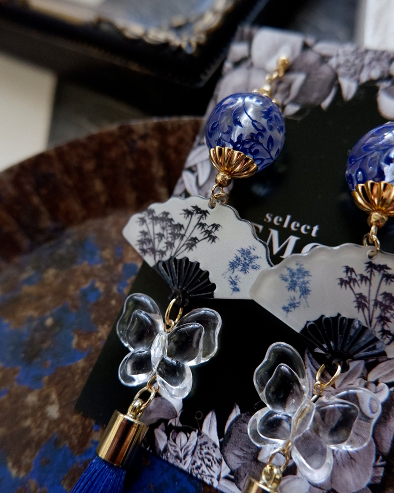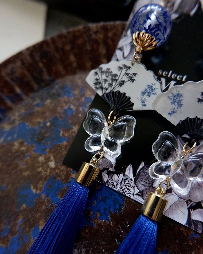 藍色の和柄ビーズに扇型パーツ、クリアバタフライ、そして鮮やかなブルータッセルを組み合わせた和モダンデザイン。