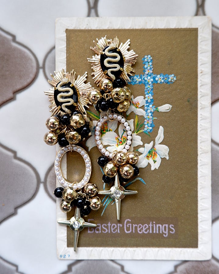 漆黒のキャンバスに絡みつくような蛇のモチーフを、光を放つ放射状のゴールドで囲んだ存在感抜群の耳飾り。