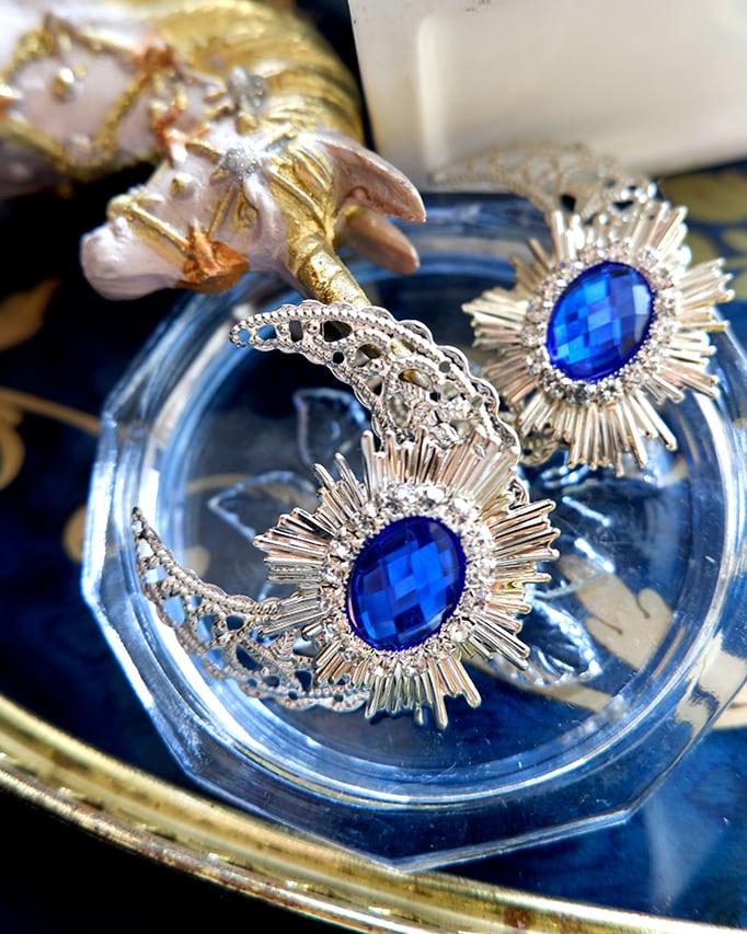 光を受けるたびにきらめくサファイアブルーのストーンが、