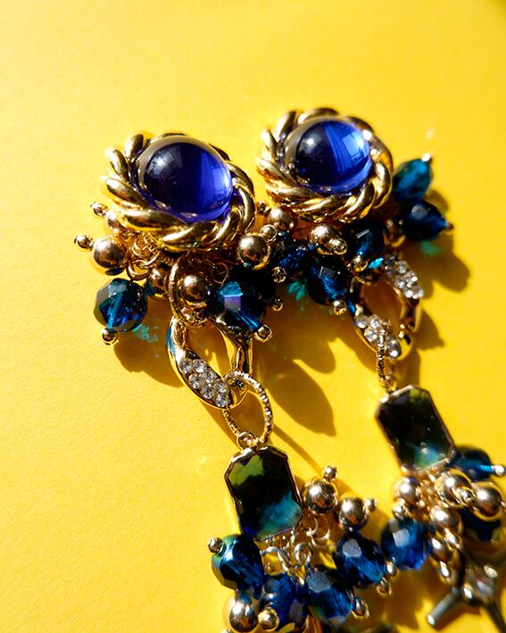 深いネイビーブルーのボタンと、星のきらめきを思わせるゴールドパーツを贅沢に組み合わせた、存在感あるロングイヤリングです。