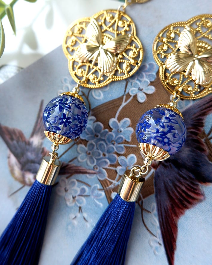 青い模様が美しいビーズとタッセルを組み合わせ、
