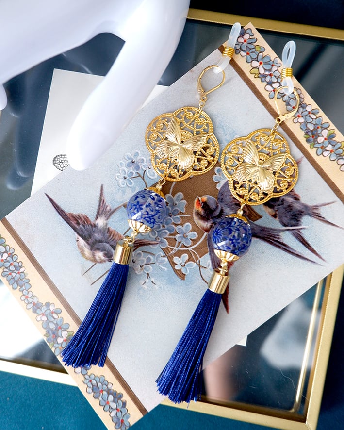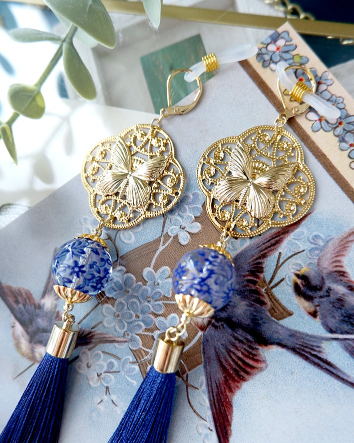 【メガネチャーム/ピアス】青の蝶とタッセル