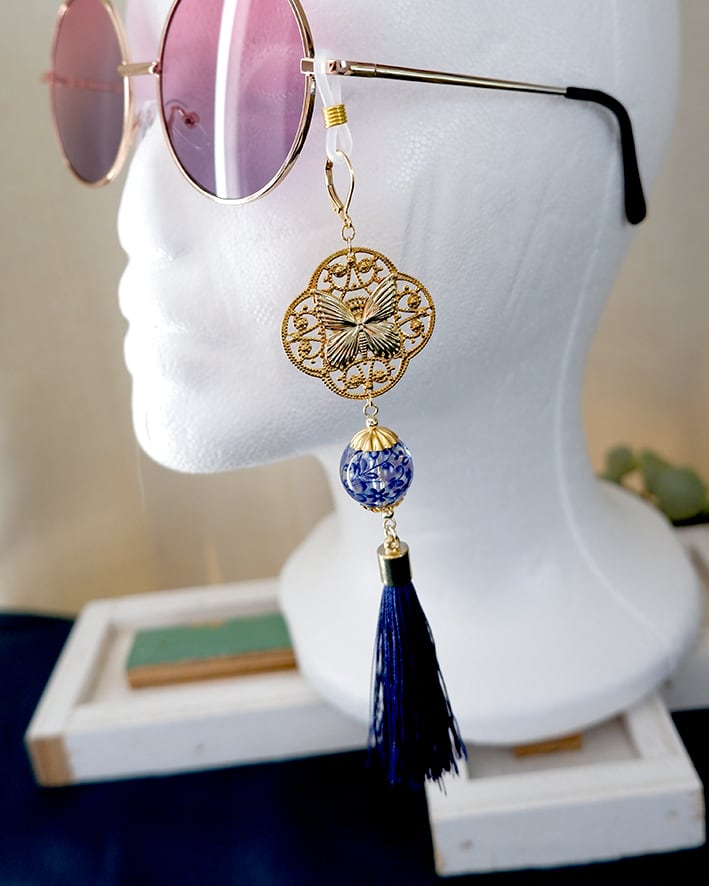 蝶の透かしモチーフに、深い青のタッセルを合わせたメガネチャーム。
