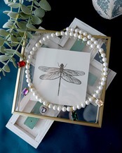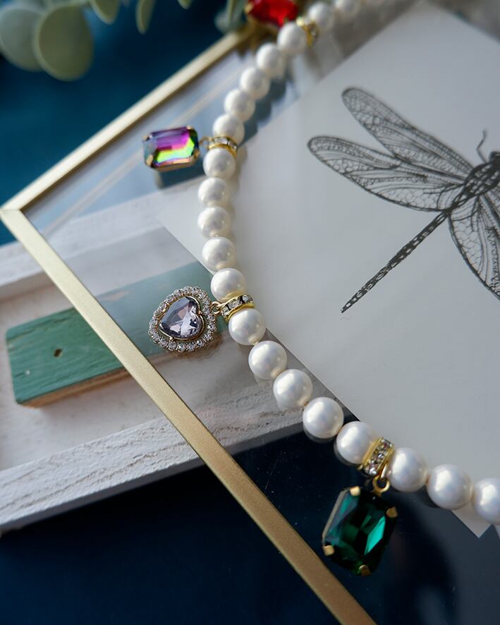 様々な色のビジューを散りばめた、華やかなパールネックレス。