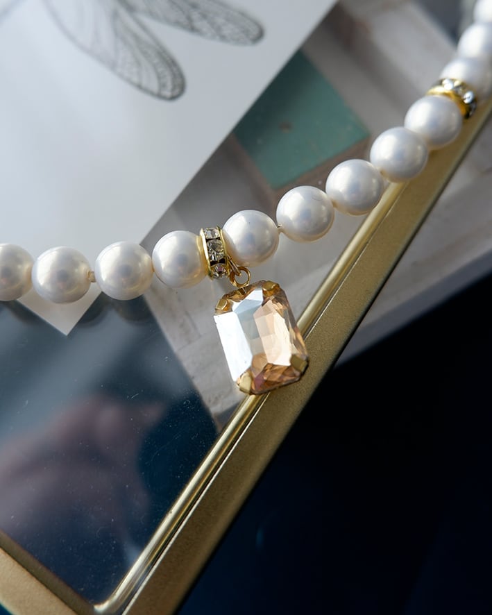 シンプルなパールネックレスに個性的な輝きを添えています。