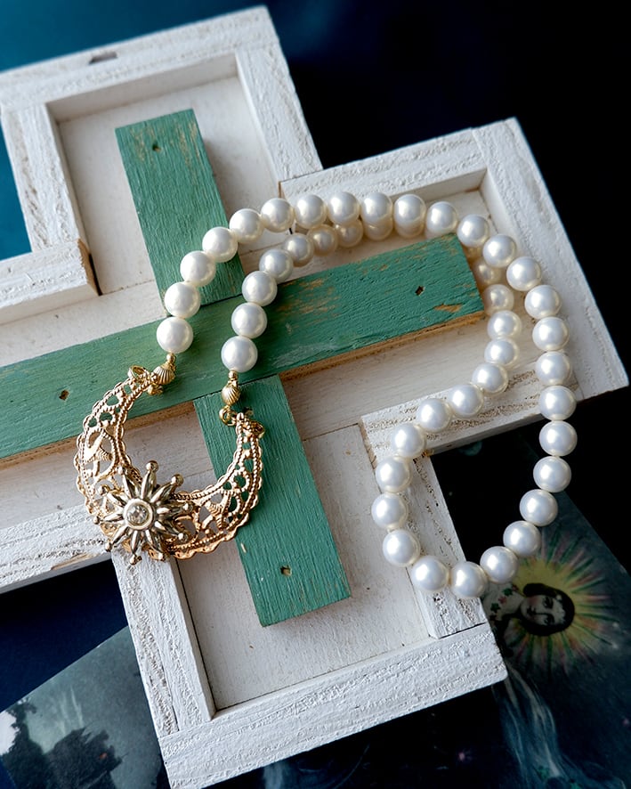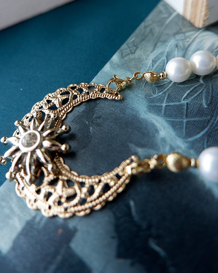 繊細な装飾パーツとパールを組み合わせた、クラシカルなネックレス。