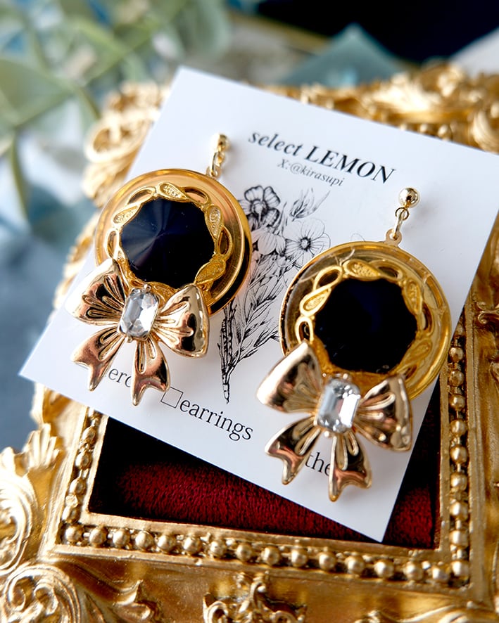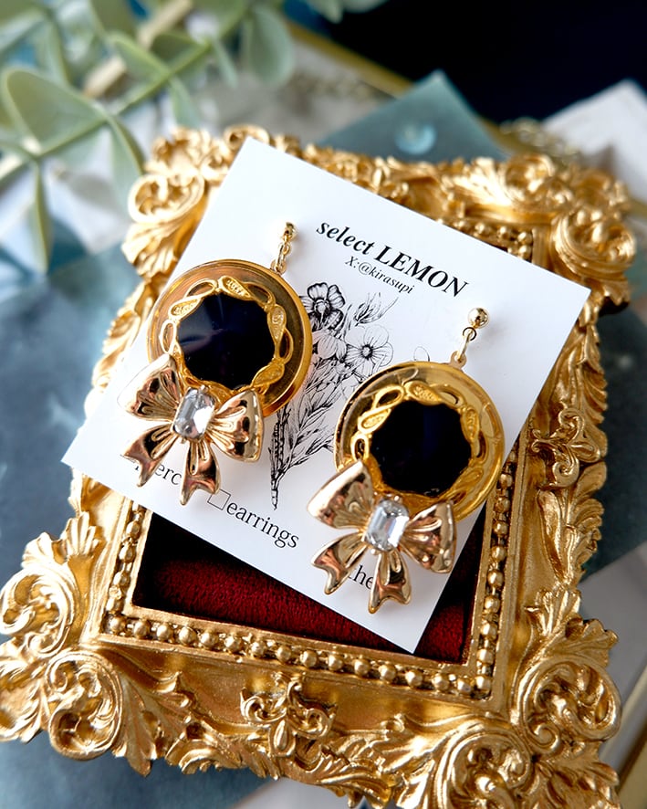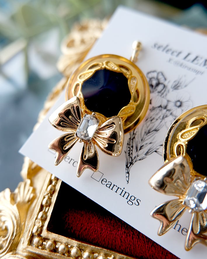 存在感のあるアンティークボタンとリボンモチーフを組み合わせたクラシカルな耳飾り
