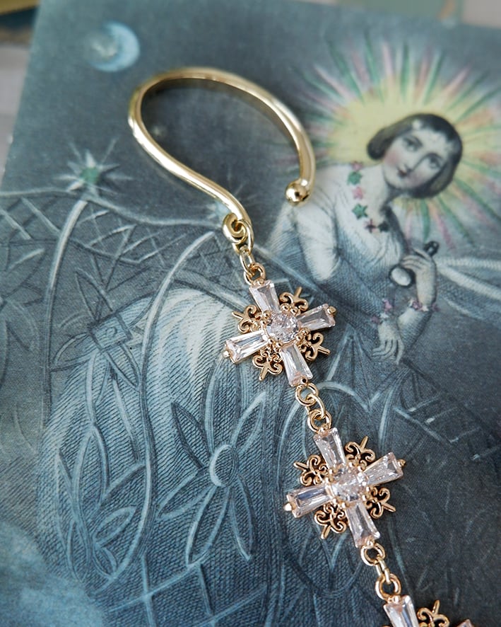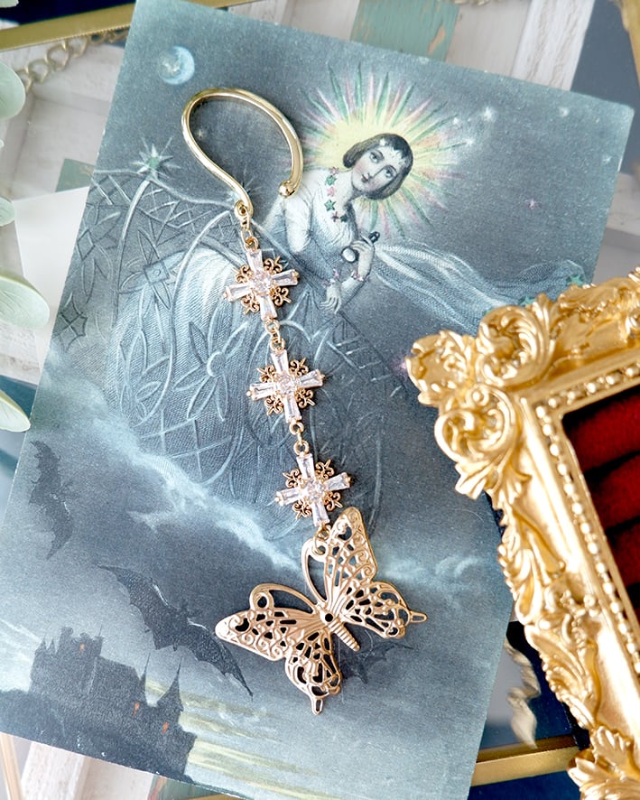 クロスモチーフと蝶の透かしパーツを組み合わせたイヤーフック。