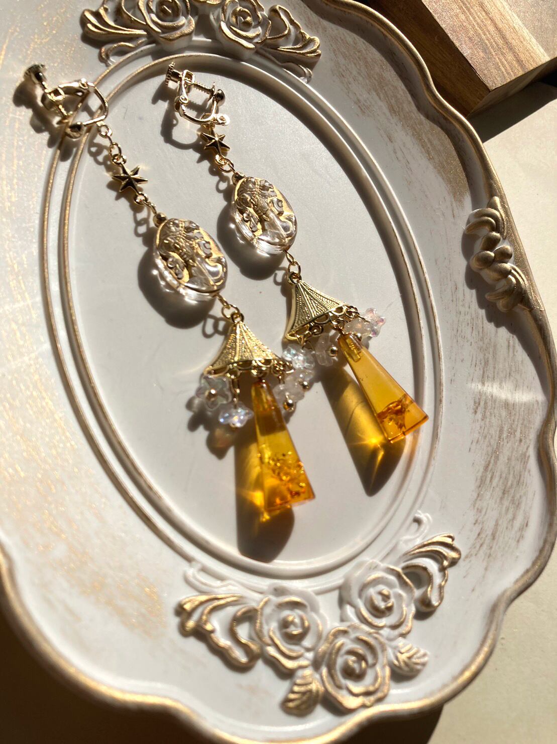 黄色い飴ちゃんのような可愛い三角のビーズはビンテージのものを使用しています。