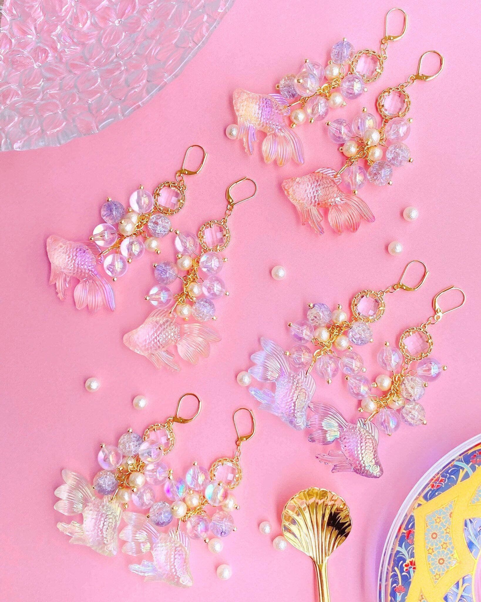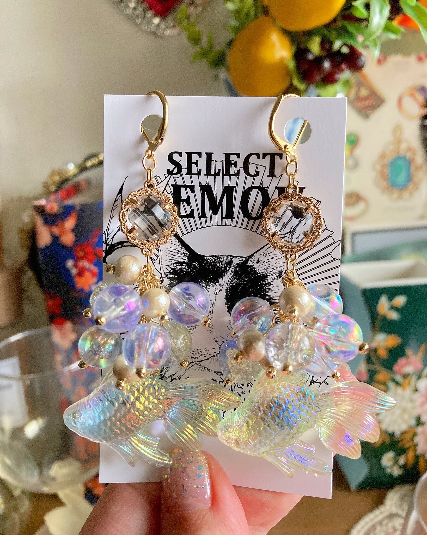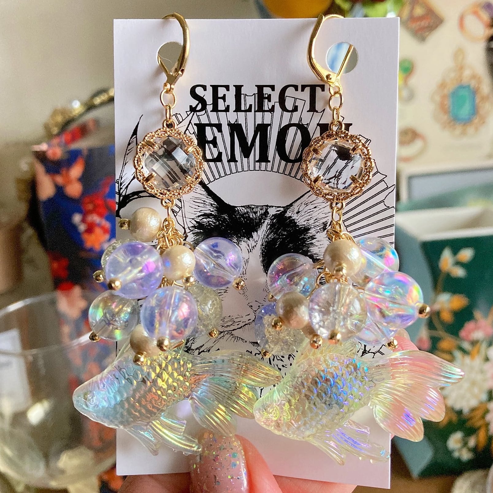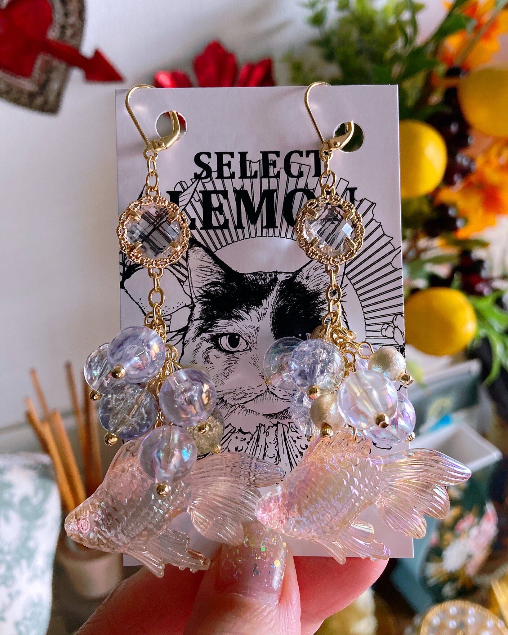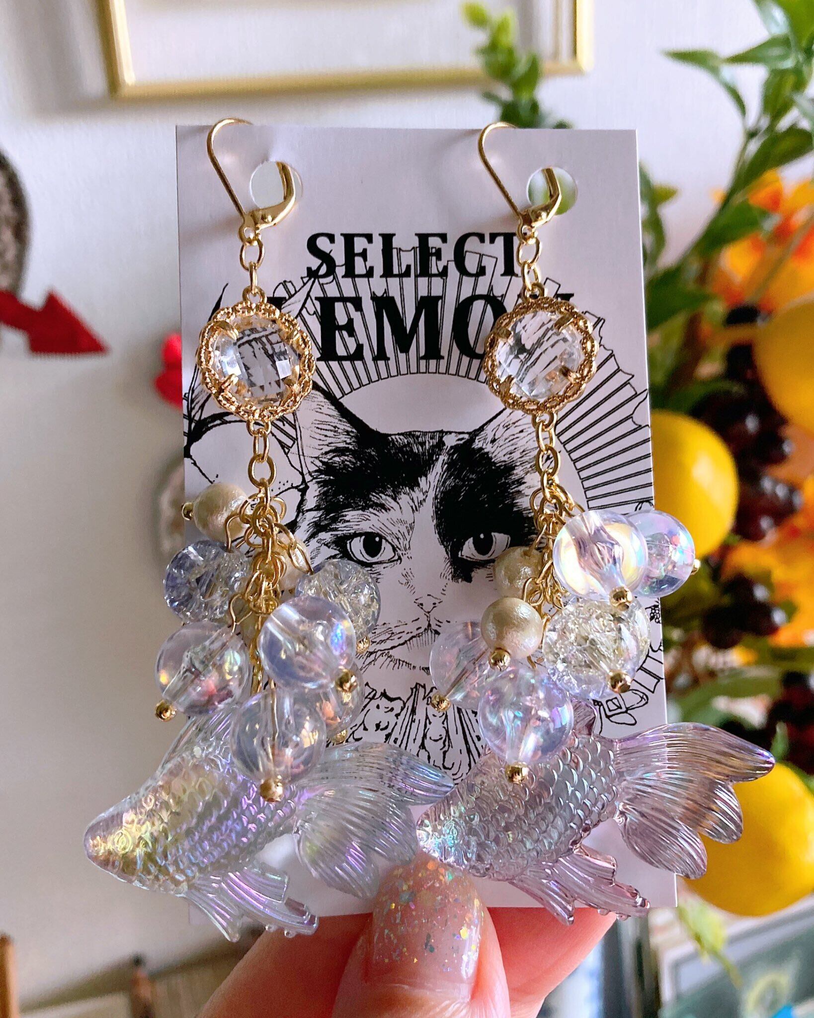 目を引く大ぶりの金魚モチーフがメインの美しい耳飾りです。