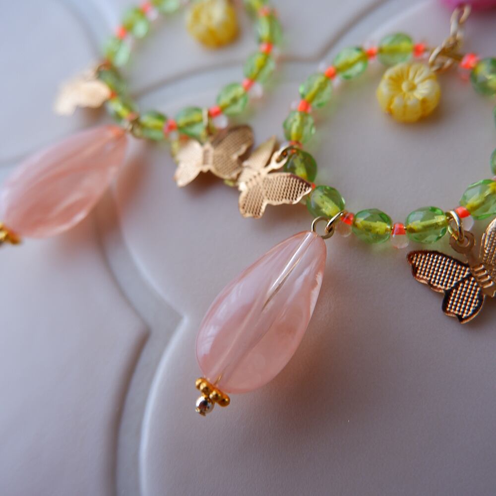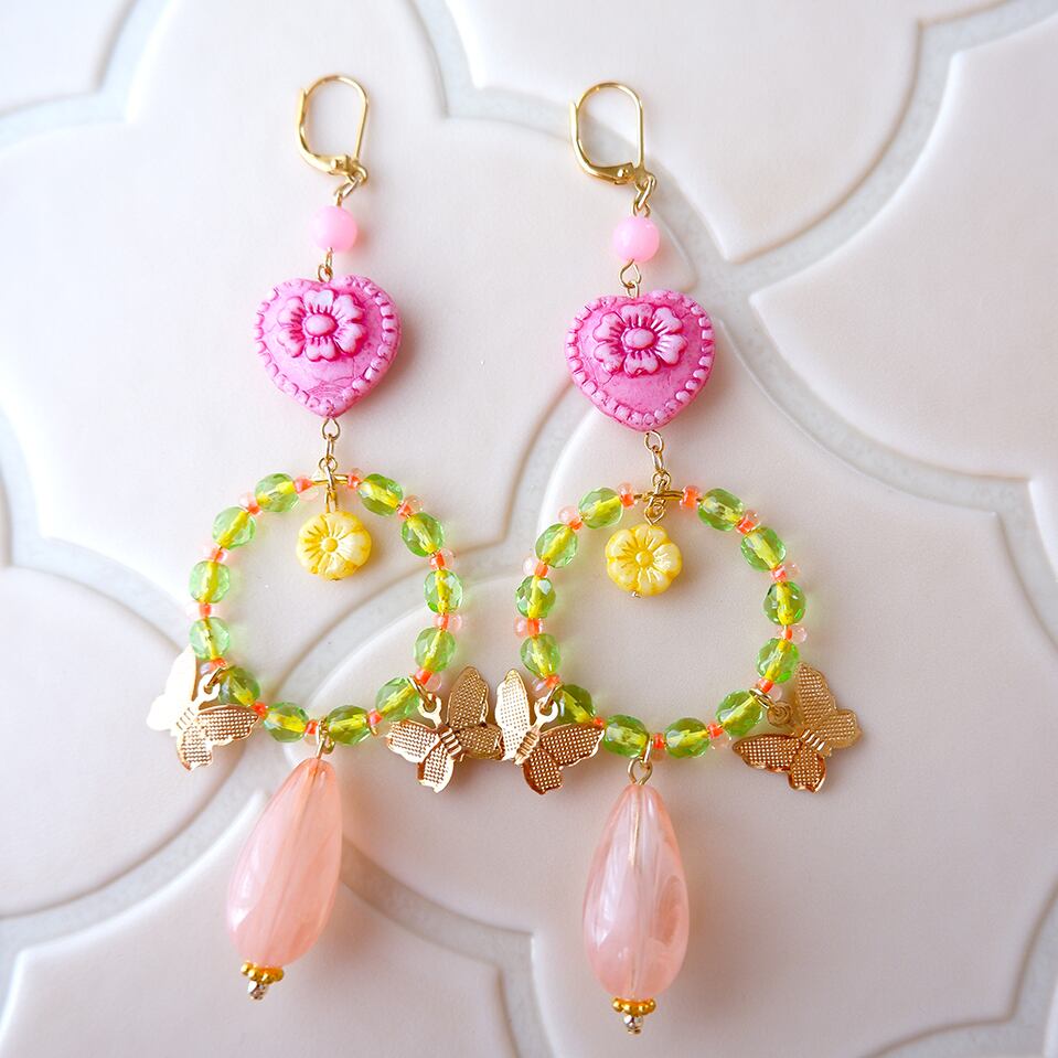 華やかで可愛らしいデザインが特徴のピアスをご紹介します。このピアスは、ピンクのハート、黄色の花、そして蝶のチャームを組み合わせ、鮮やかでエレガントなスタイルを演出します。特別な日にも日常使いにもぴったりのアイテムです。