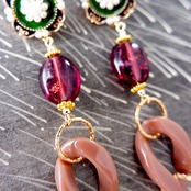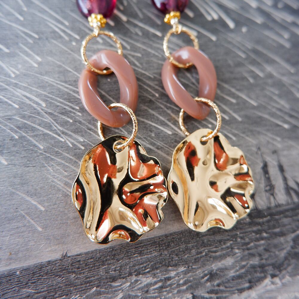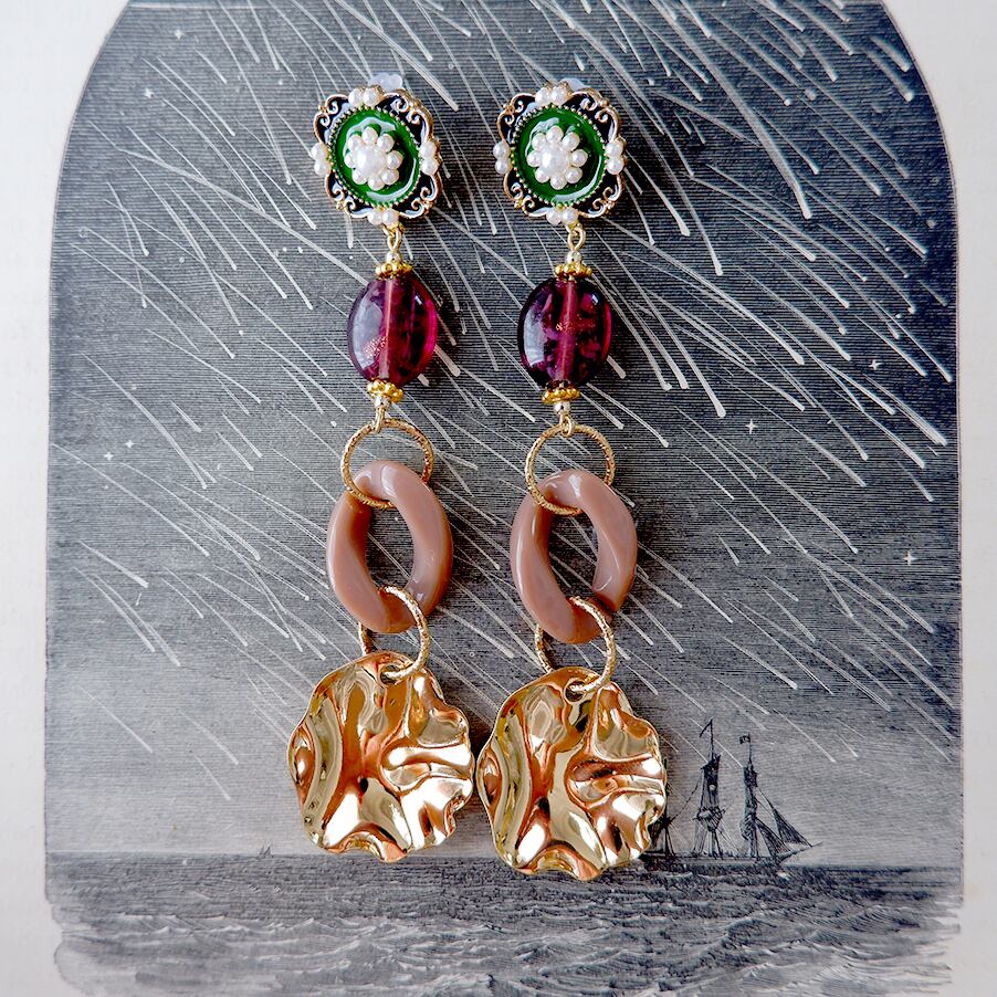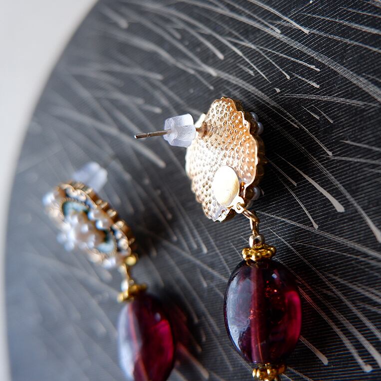 甘くて苦い葡萄キャンディのような深みのある美しいガラスビーズを使用した、どこか懐かしい雰囲気のある耳飾りです。